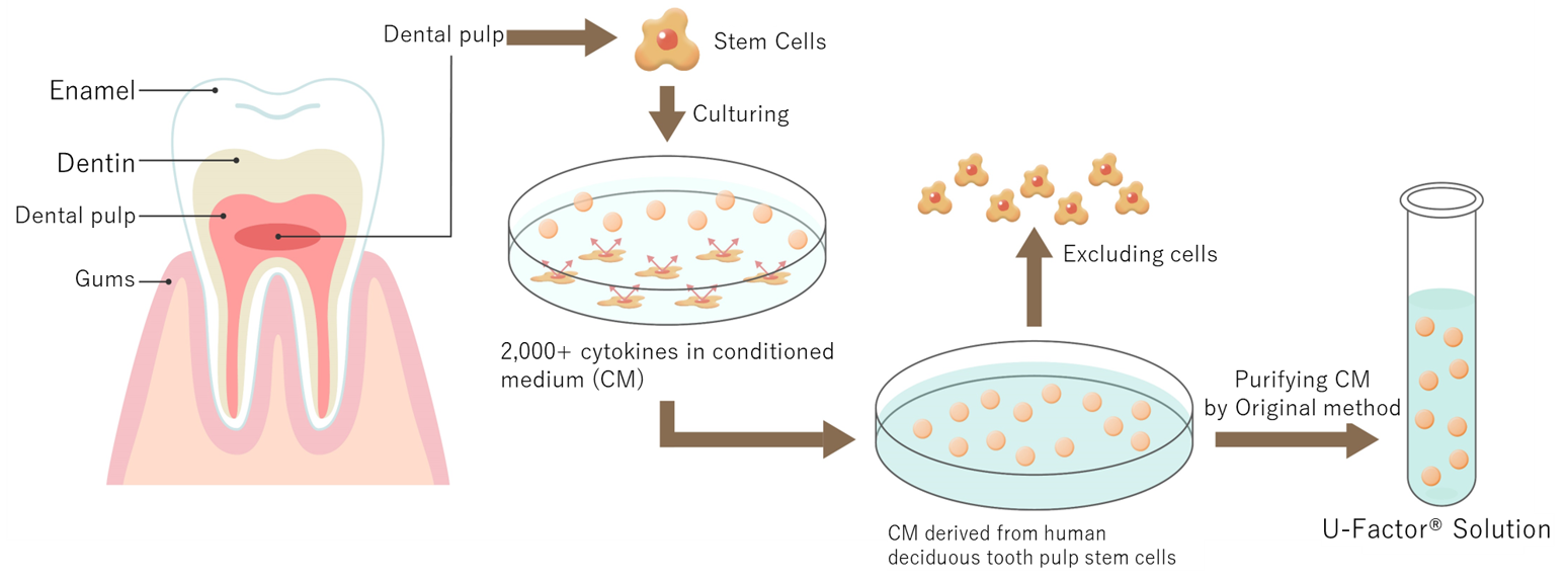 U-Factor solution is a highly purified culture supernatant obtained through U-Factor’s proprietary technology during the cultivation of stem cells. It contains a large quantity of cytokines (proteins with physiological effects) secreted by the stem cells. The efficacy of this solution was first discovered by U-Factor’s Director and Professor Emeritus Minoru Ueda of Nagoya University Graduate School of Medicine and colleagues (M Ueda, et al. Neurosci 2015). U-Factor solution, further refined and purified through advanced methods, holds significant potential in terms of safety and efficacy.